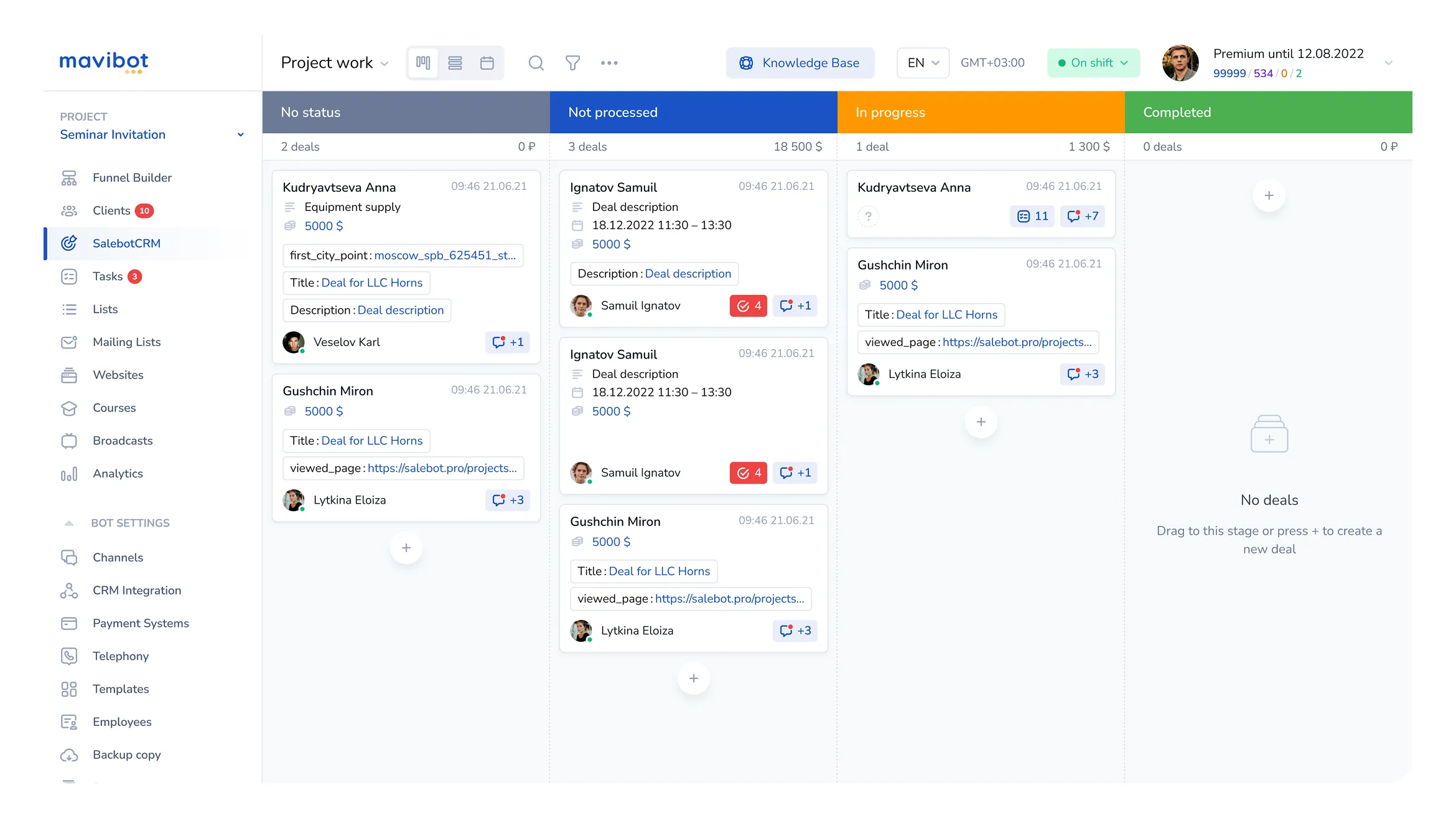 CRM Salebot is a convenient system for tracking clients, inquiries, and sales on a single platform. It collects leads from Telegram, VKontakte, MAX, email, and your website, converts them into deals, and helps manage the entire sales cycle without losing inquiries.