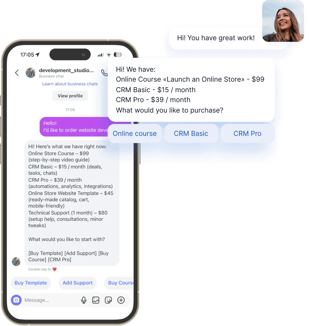 Accept payments in the bot, send reminders, collect feedback, and expand your customer base without manual work