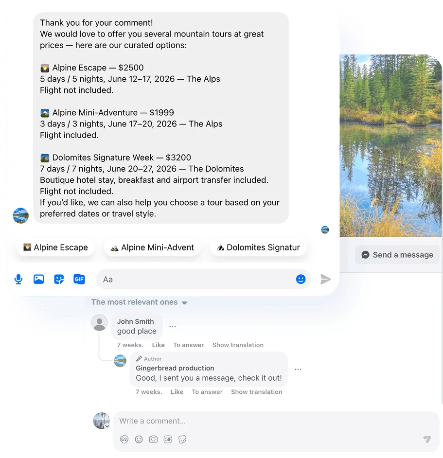 Mavibot позволяет настроить автоответы на комментарии под постами: бот читает комментарий и отправляет клиенту личное сообщение в Messenger. Вы можете задать ключевые слова или реагировать на все комментарии подряд.