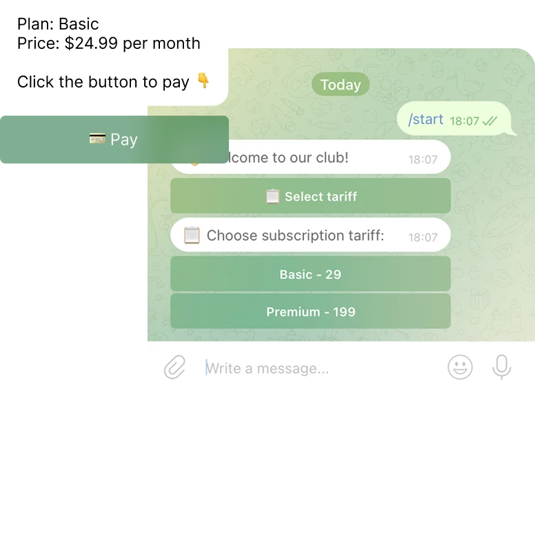 Accept payments by cards, SBP, wallets and other methods directly in the chatbot