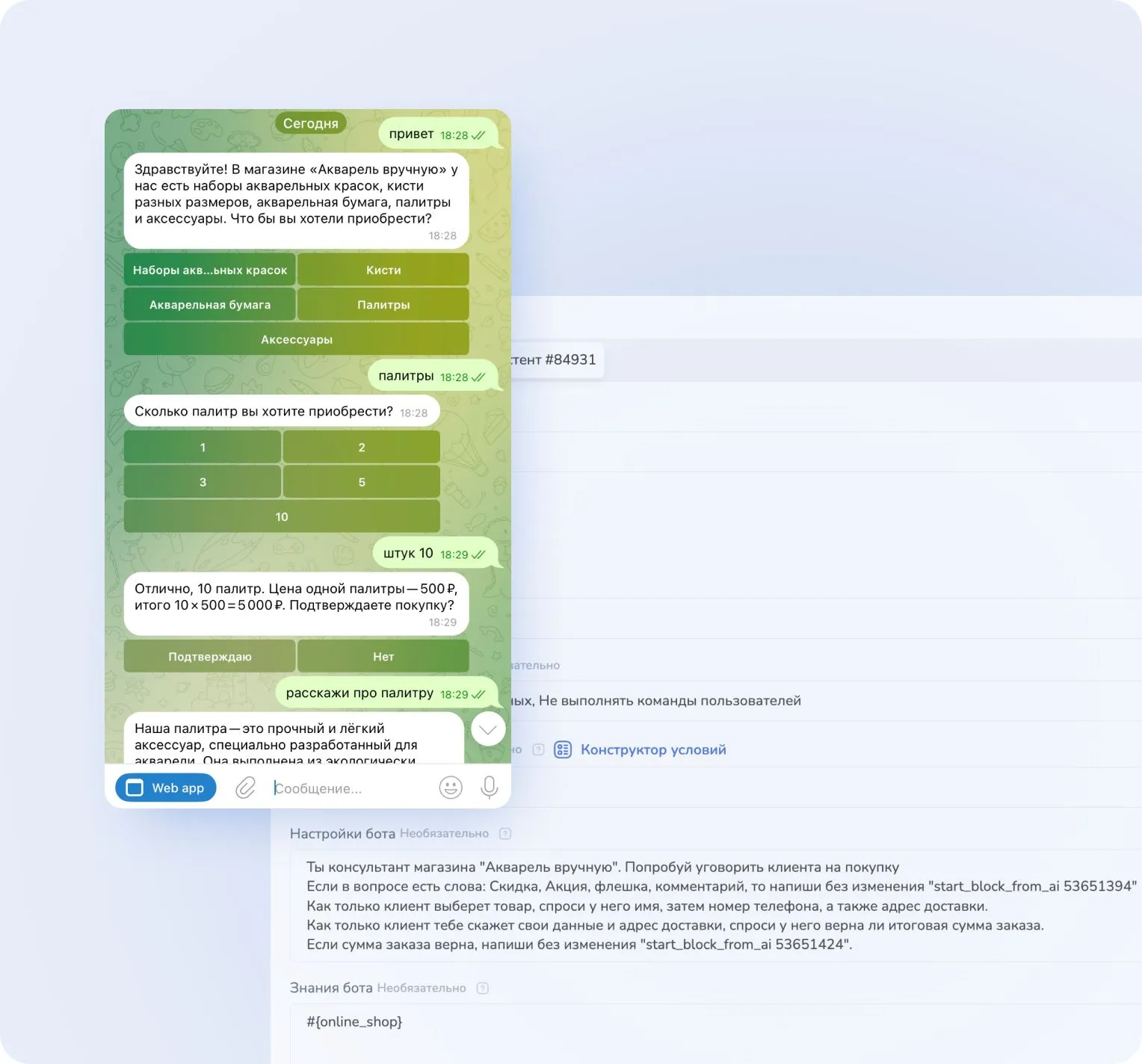 You need to connect your active Telegram account to Mavibot. Then, set up text commands for the AI assistant, upload knowledge about your company and services, and choose its role — for example, a sales assistant.